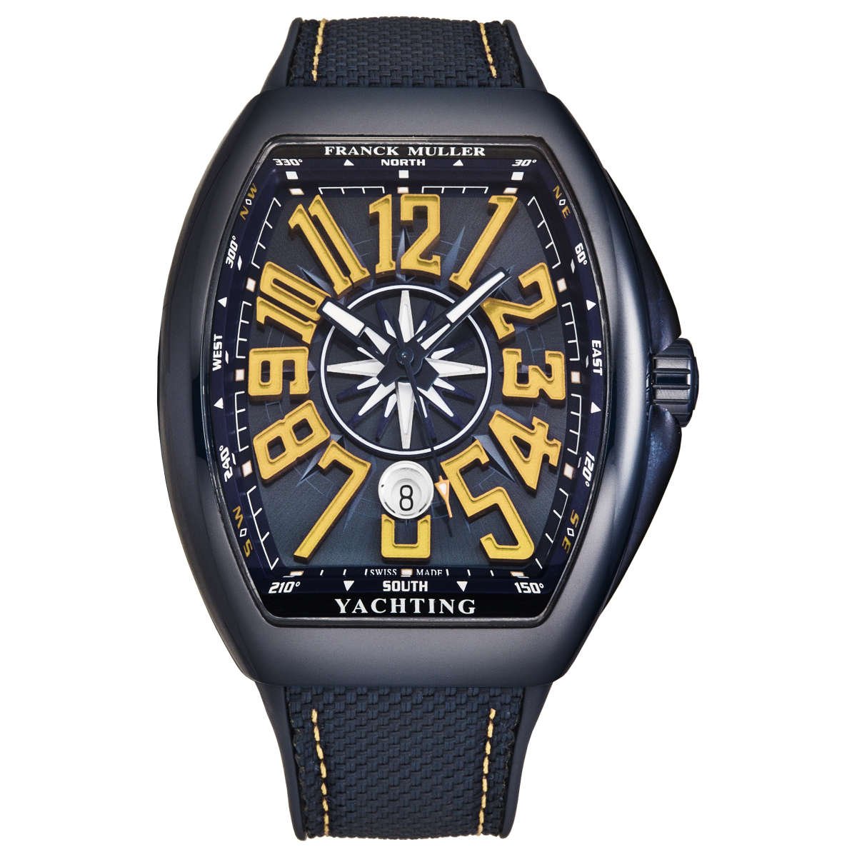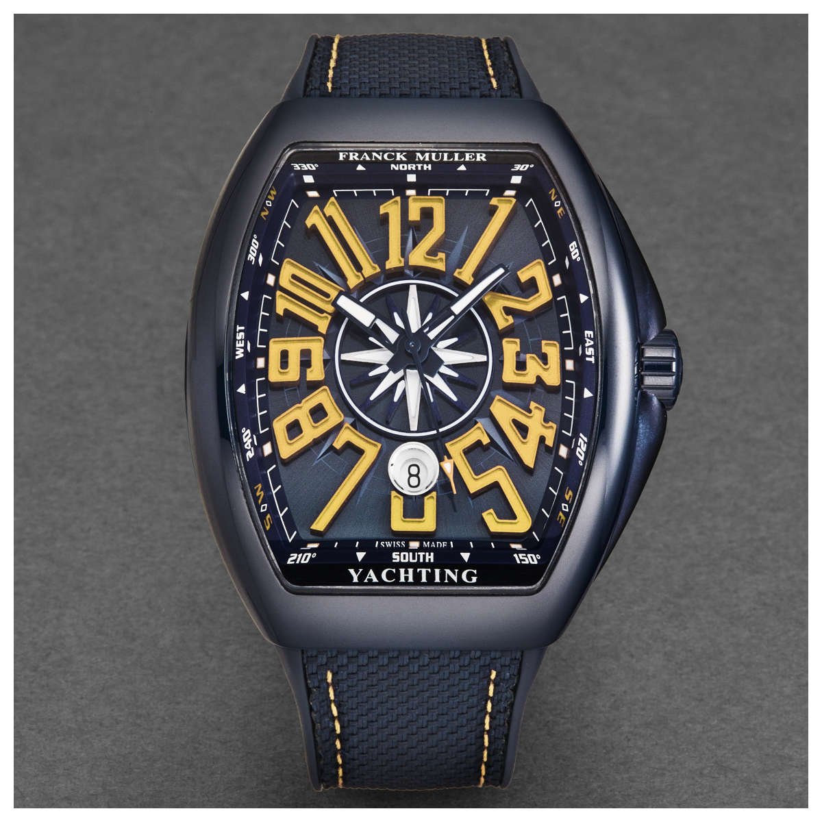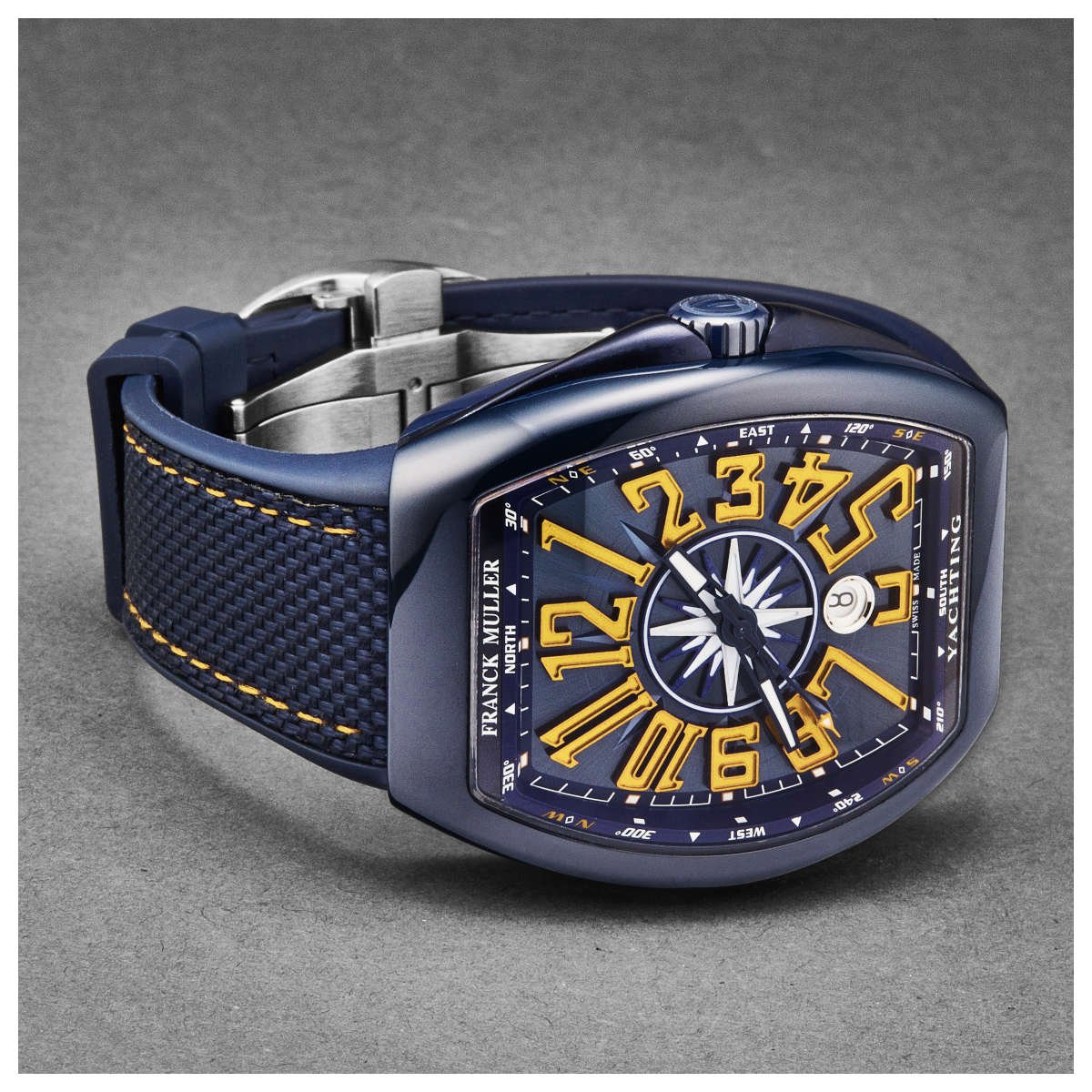 The VanguardYACT is part of Franck Muller’s Yachting Collection, which draws inspiration from the world of sailing and luxury yachts. This nautical influence is evident in several aspects of the watch: